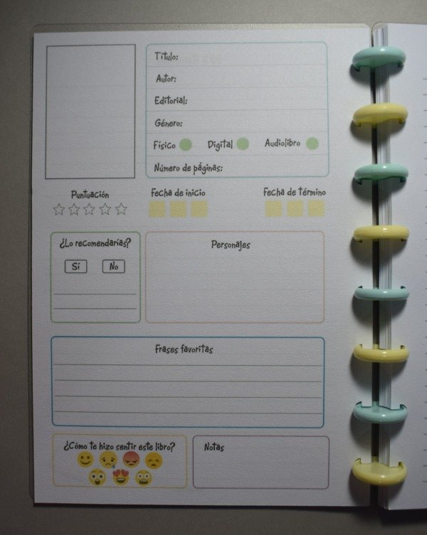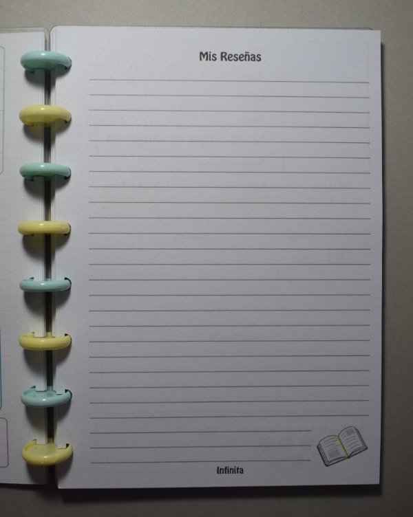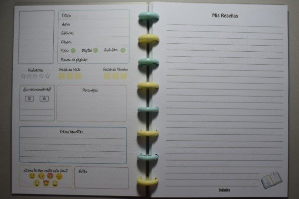 Cuenta con espacio para registrar 50 reseñas de libros, con secciones para anotar título, autor, citas favoritas, sensaciones, aprendizajes y más.